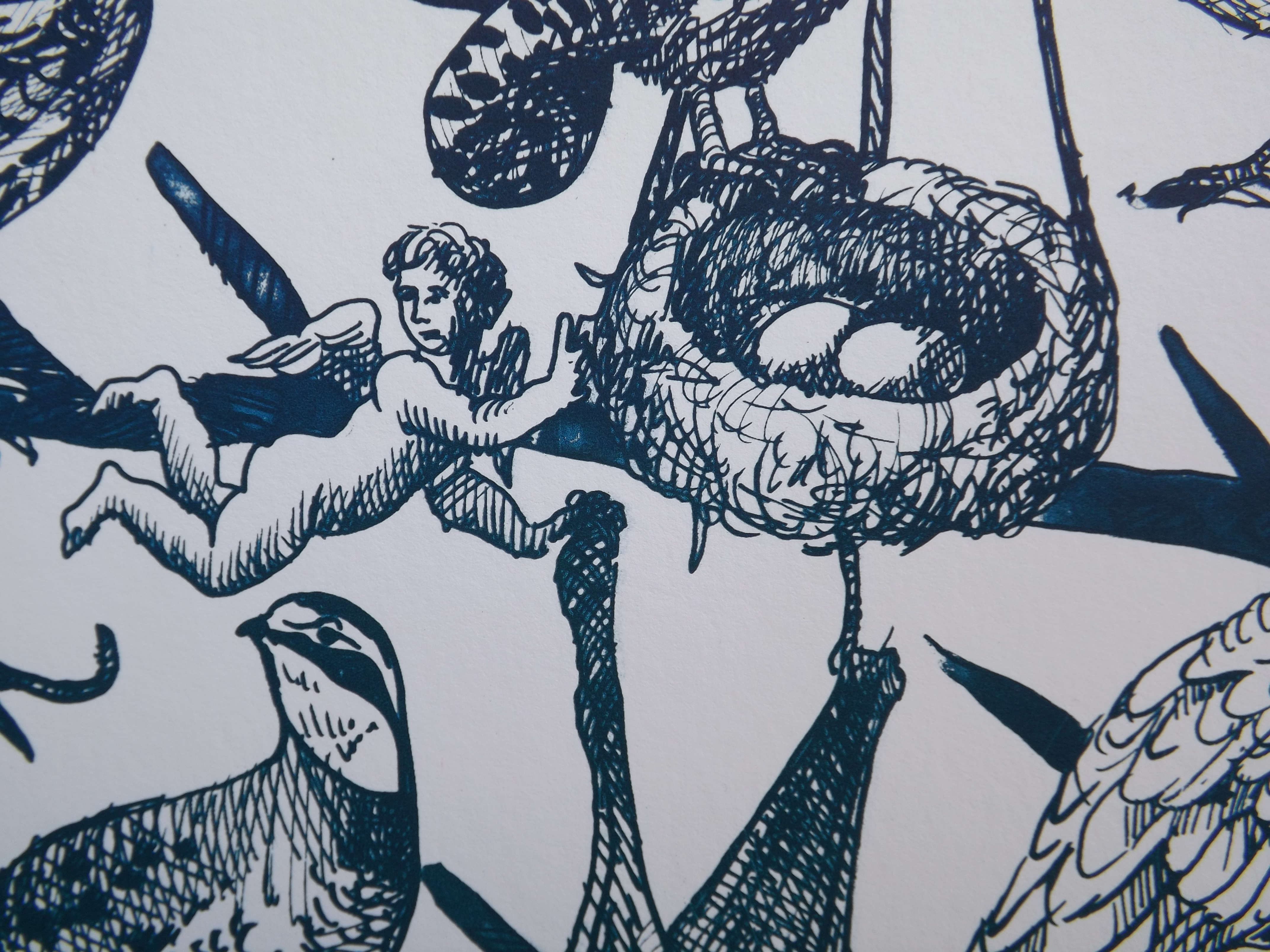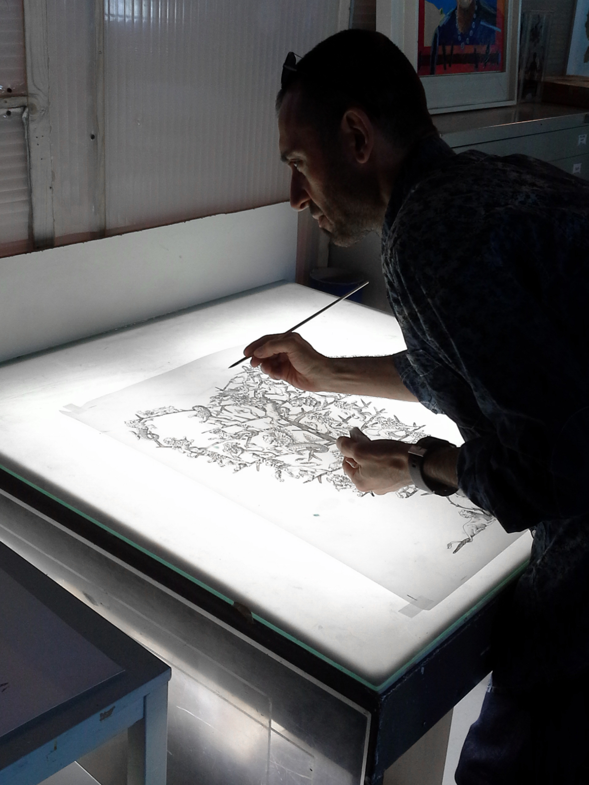 The original compositions were created in black ink on paper and then translated into limited-edition Iris silkscreen prints using two color layers. Variations in the printing process render each piece unique. While produced in series, each print is treated as an original work.